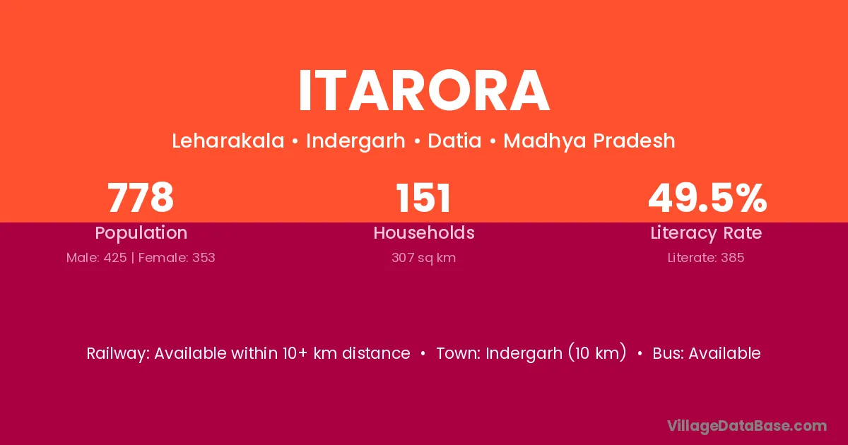 Itarora village has a total population of 778 people, of which 425 are males and 353 are females.