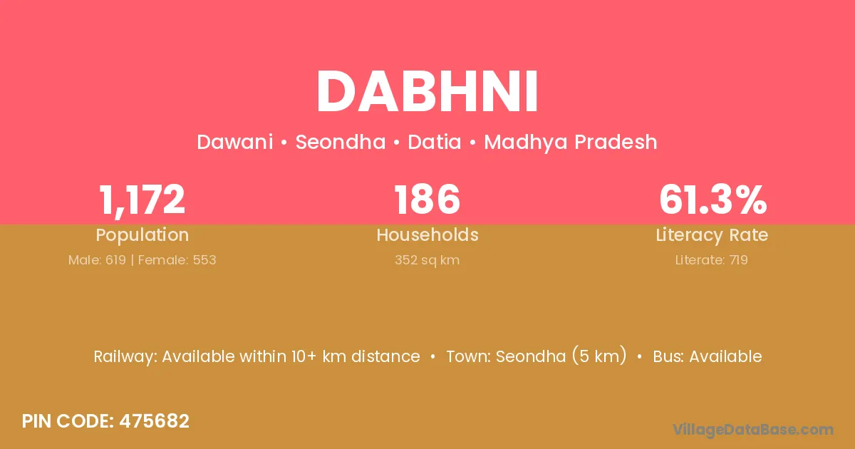 Seondha (5 km) is the nearest town to Dabhni village for major economic activities and is located approximately 5 km away.