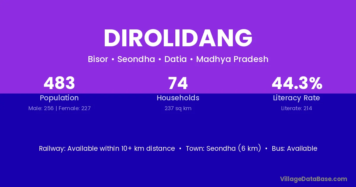 Seondha (6 km) is the nearest town to Dirolidang village for major economic activities and is located approximately 6 km away.