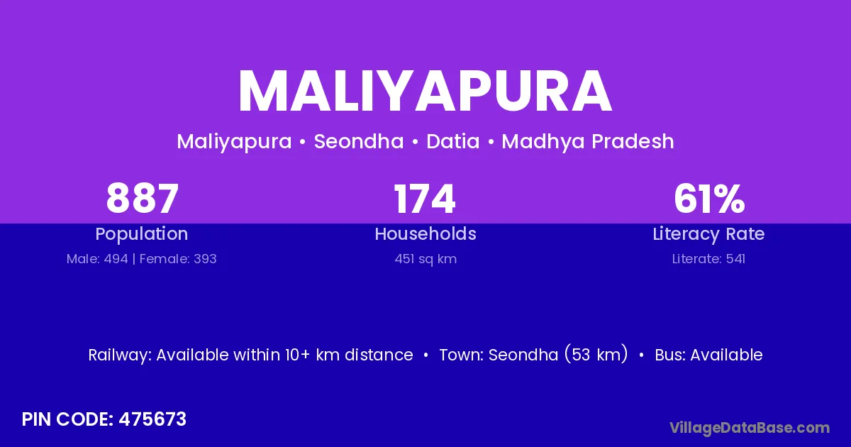 Maliyapura village has a total population of 887 people, of which 494 are males and 393 are females.