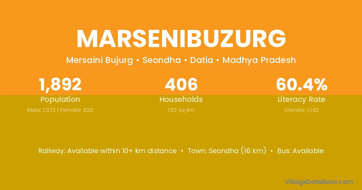 Seondha (16 km) is the nearest town to Marsenibuzurg village for major economic activities and is located approximately 16 km away.