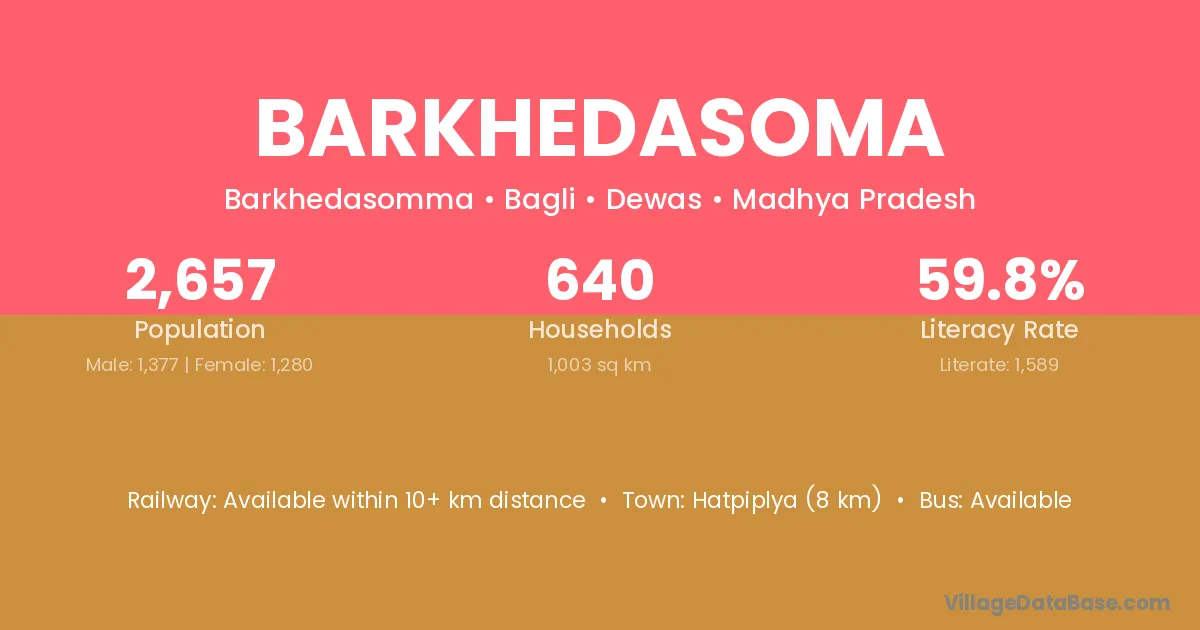 Hatpiplya (8 km) is the nearest town to Barkhedasoma village for major economic activities and is located approximately 8 km away.