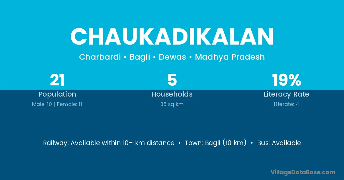 Bagli (10 km) is the nearest town to Chaukadikalan village for major economic activities and is located approximately 10 km away.