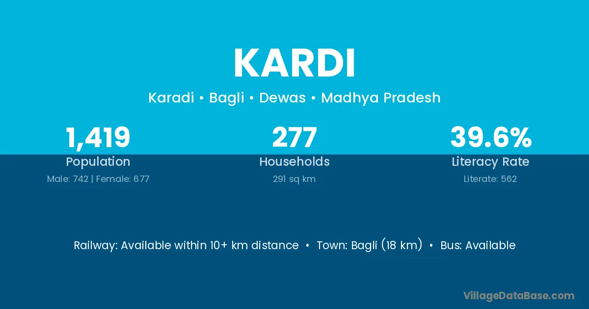 Bagli (18 km) is the nearest town to Kardi village for major economic activities and is located approximately 18 km away.