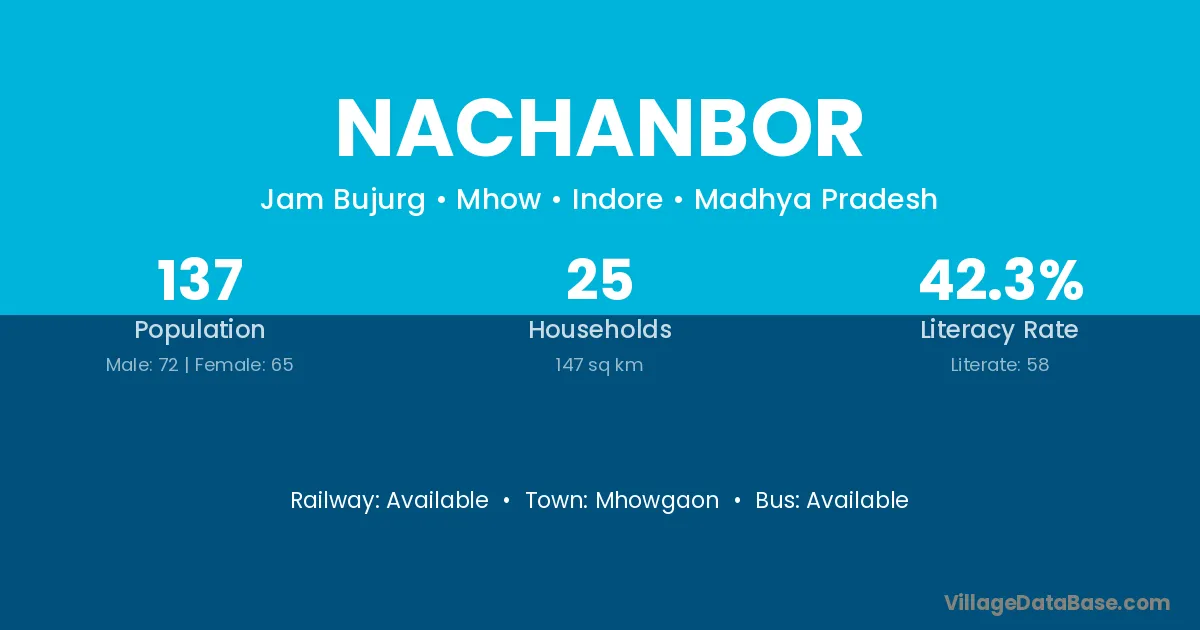 Bagli (65 km) is the nearest town to Nachanbor village for major economic activities and is located approximately 65 km away.
