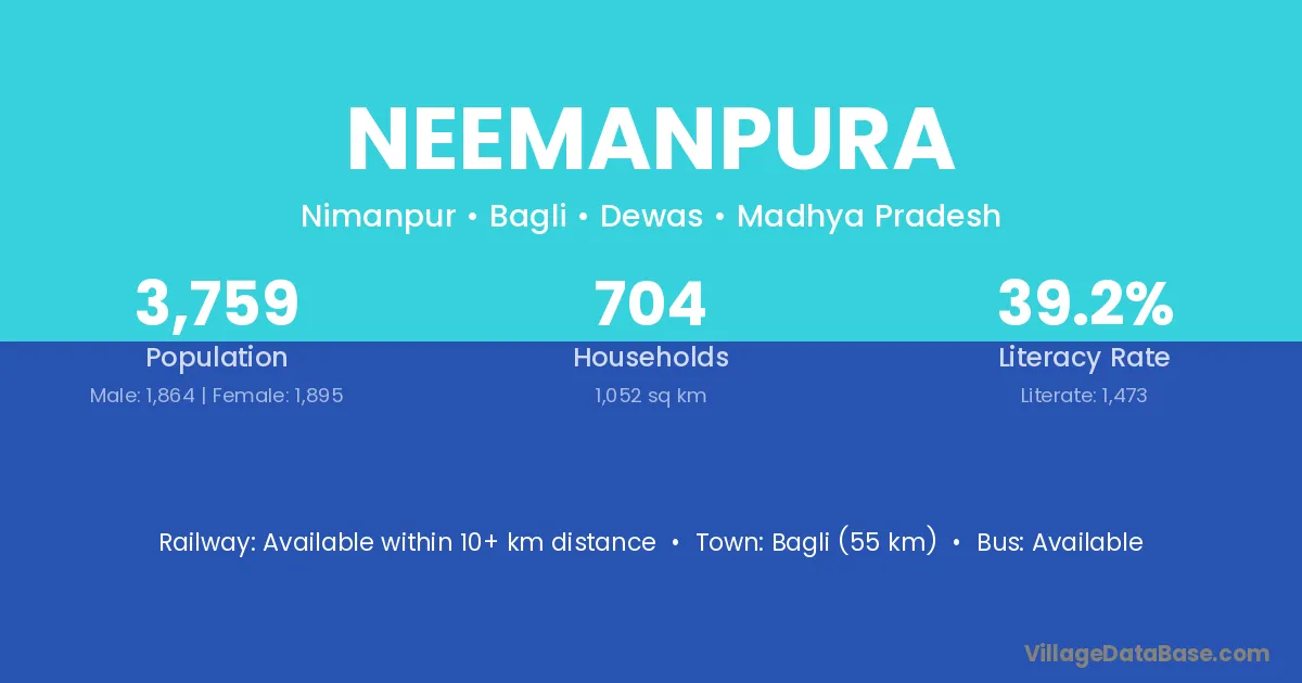 Bagli (55 km) is the nearest town to Neemanpura village for major economic activities and is located approximately 55 km away.