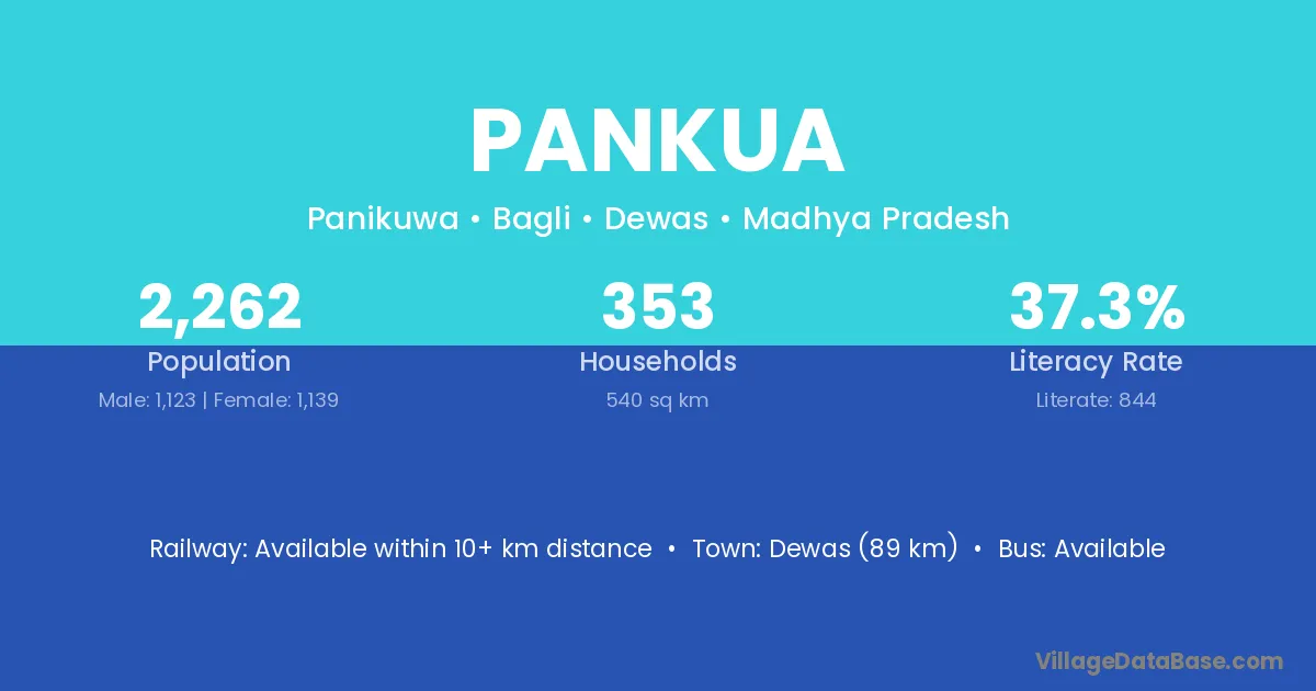 Dewas (89 km) is the nearest town to Pankua village for major economic activities and is located approximately 89 km away.