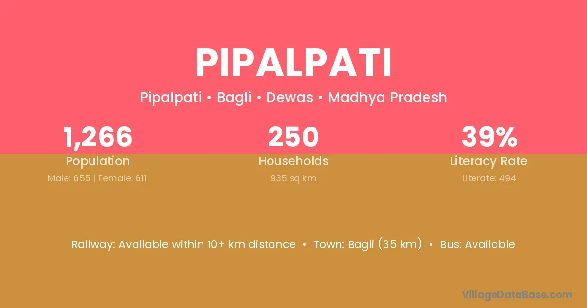 Pipalpati village has a total population of 1,266 people, of which 655 are males and 611 are females.