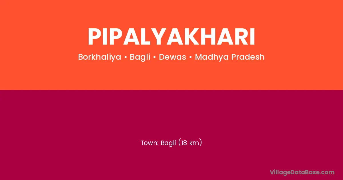 Bagli (18 km) is the nearest town to Pipalyakhari village for major economic activities and is located approximately 18 km away.