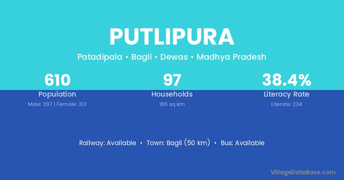 Bagli (50 km) is the nearest town to Putlipura village for major economic activities and is located approximately 50 km away.