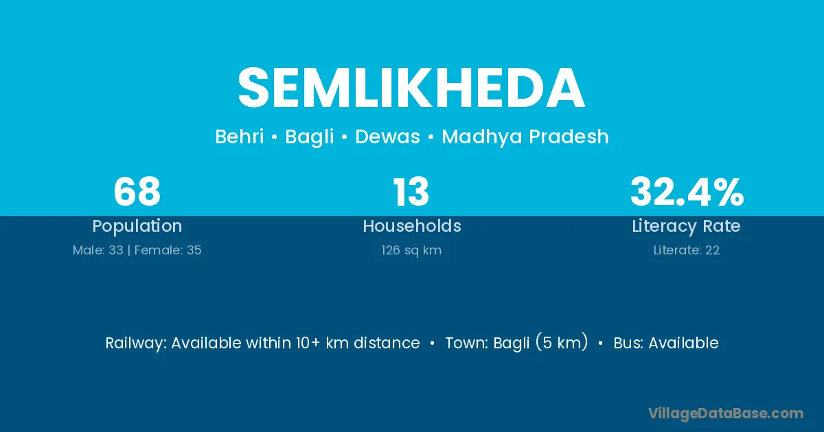 Bagli (5 km) is the nearest town to Semlikheda village for major economic activities and is located approximately 5 km away.