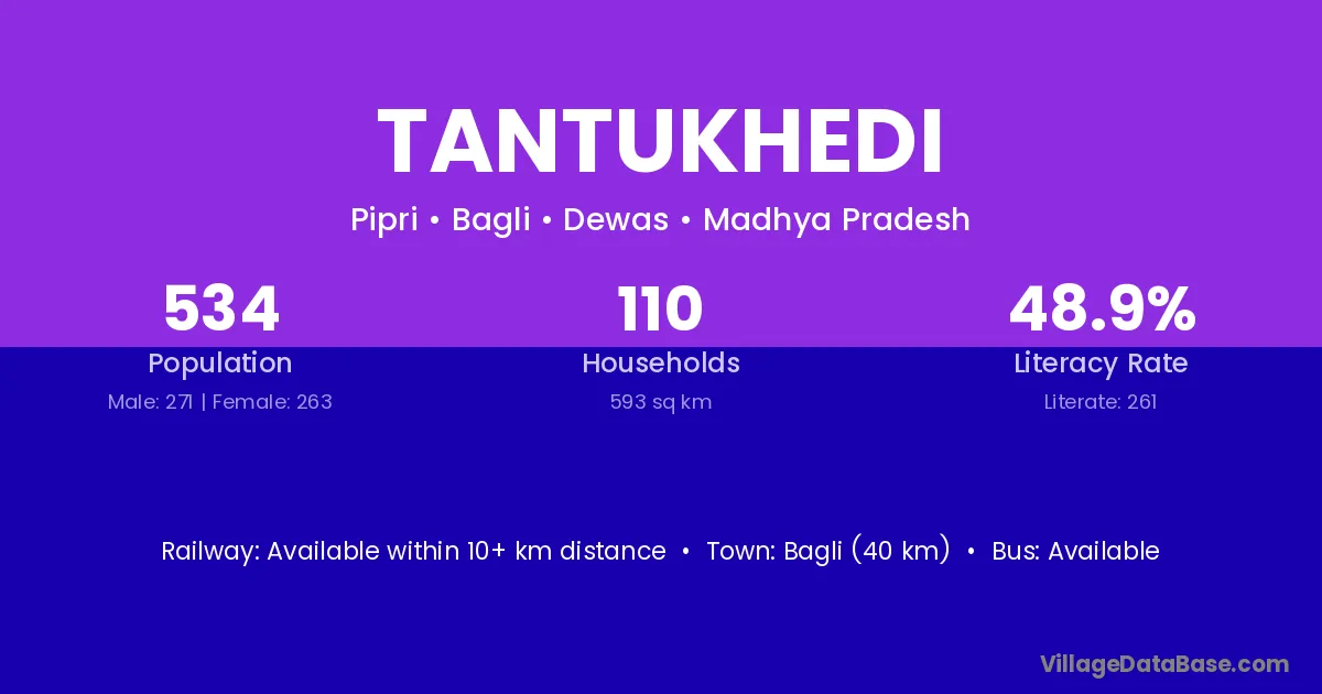 Bagli (40 km) is the nearest town to Tantukhedi village for major economic activities and is located approximately 40 km away.