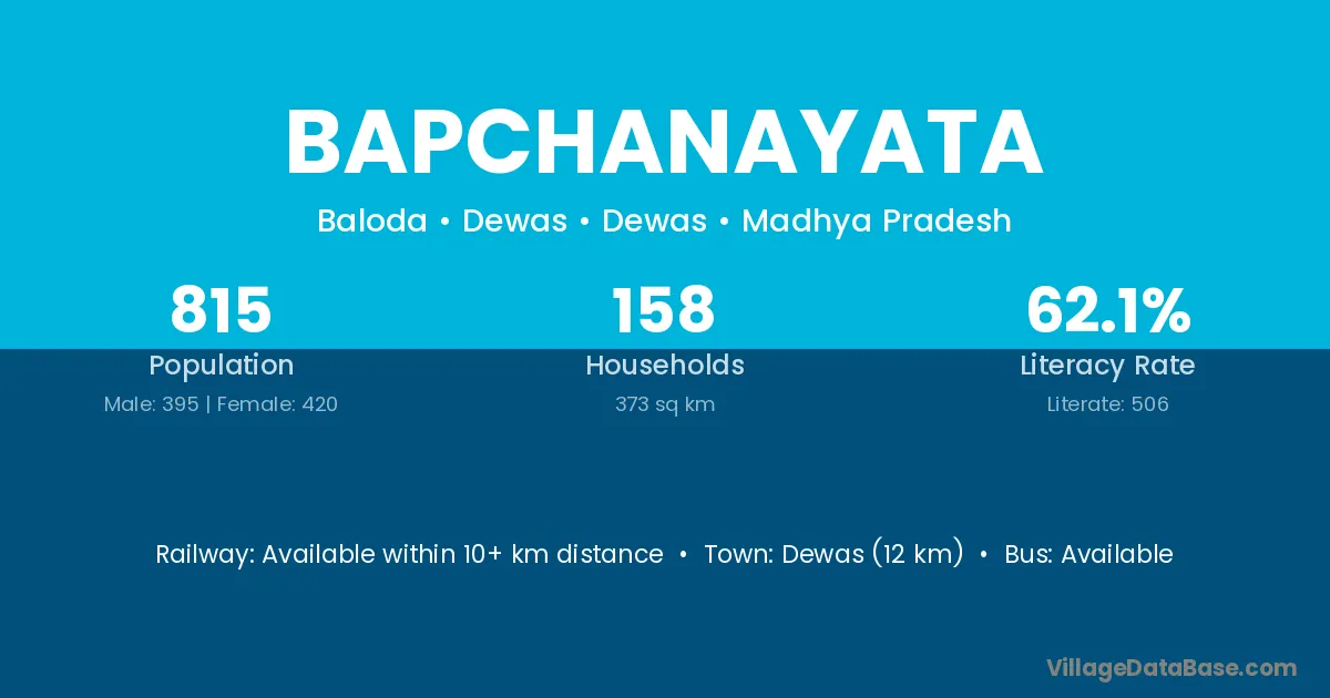 Dewas (12 km) is the nearest town to Bapchanayata village for major economic activities and is located approximately 12 km away.