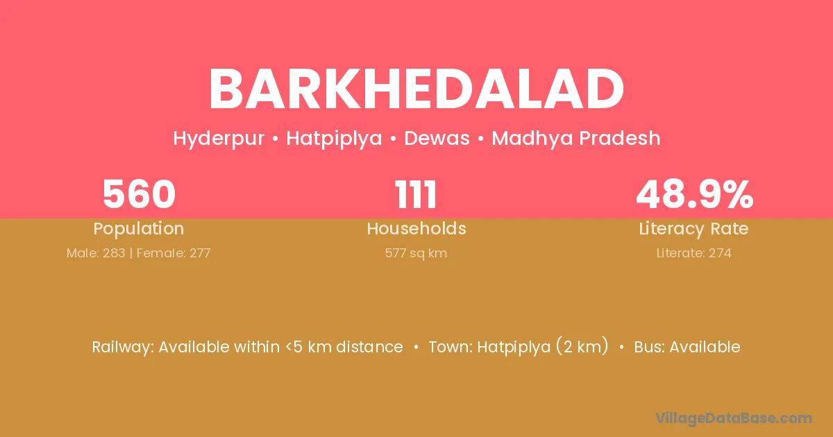 Hatpiplya (2 km) is the nearest town to Barkhedalad village for major economic activities and is located approximately 2 km away.