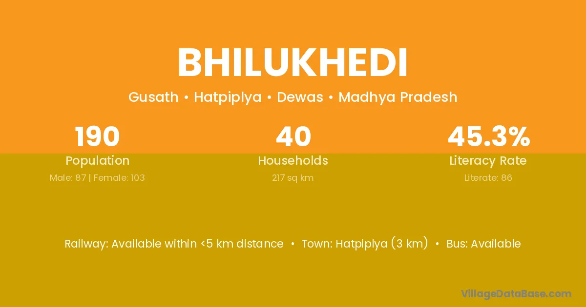Bhilukhedi village has a total population of 190 people, of which 87 are males and 103 are females.