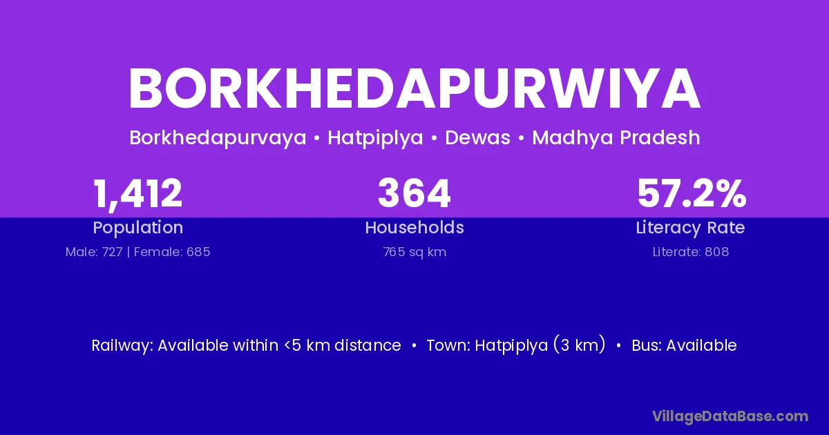 Borkhedapurwiya village has a total population of 1,412 people, of which 727 are males and 685 are females.