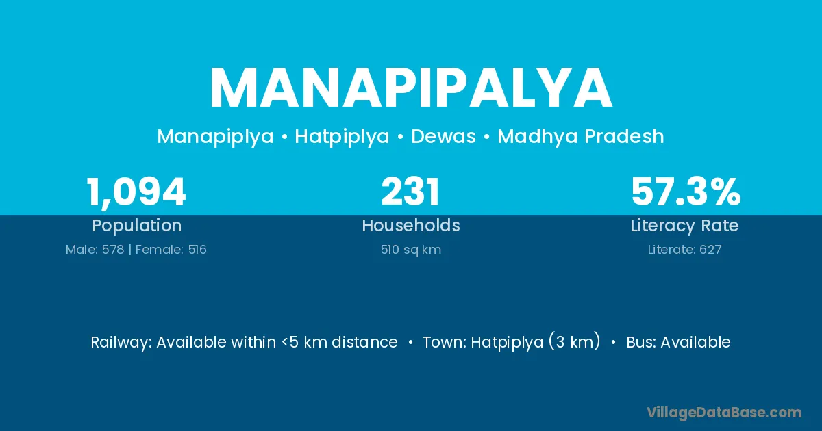 Hatpiplya (3 km) is the nearest town to Manapipalya village for major economic activities and is located approximately 3 km away.