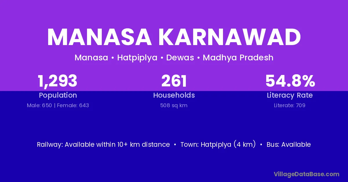 Hatpiplya (4 km) is the nearest town to Manasa Karnawad village for major economic activities and is located approximately 4 km away.