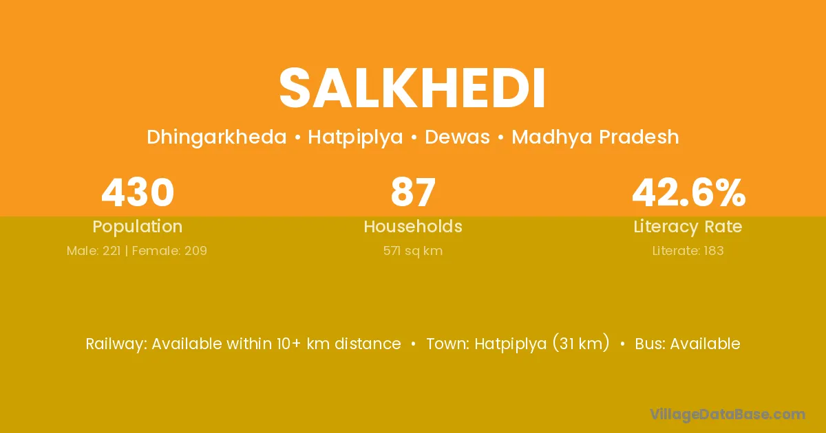 Hatpiplya (31 km) is the nearest town to Salkhedi village for major economic activities and is located approximately 31 km away.