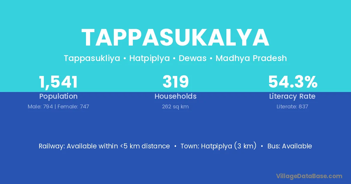 Hatpiplya (3 km) is the nearest town to Tappasukalya village for major economic activities and is located approximately 3 km away.