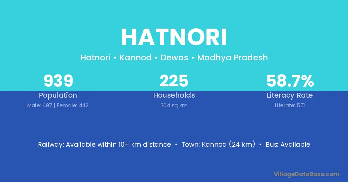 Kannod (24 km) is the nearest town to Hatnori village for major economic activities and is located approximately 24 km away.