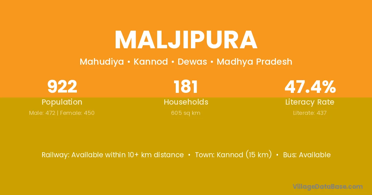 Kannod (15 km) is the nearest town to Maljipura village for major economic activities and is located approximately 15 km away.