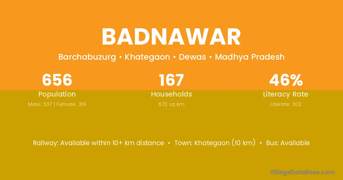 Khategaon (10 km) is the nearest town to Badnawar village for major economic activities and is located approximately 10 km away.