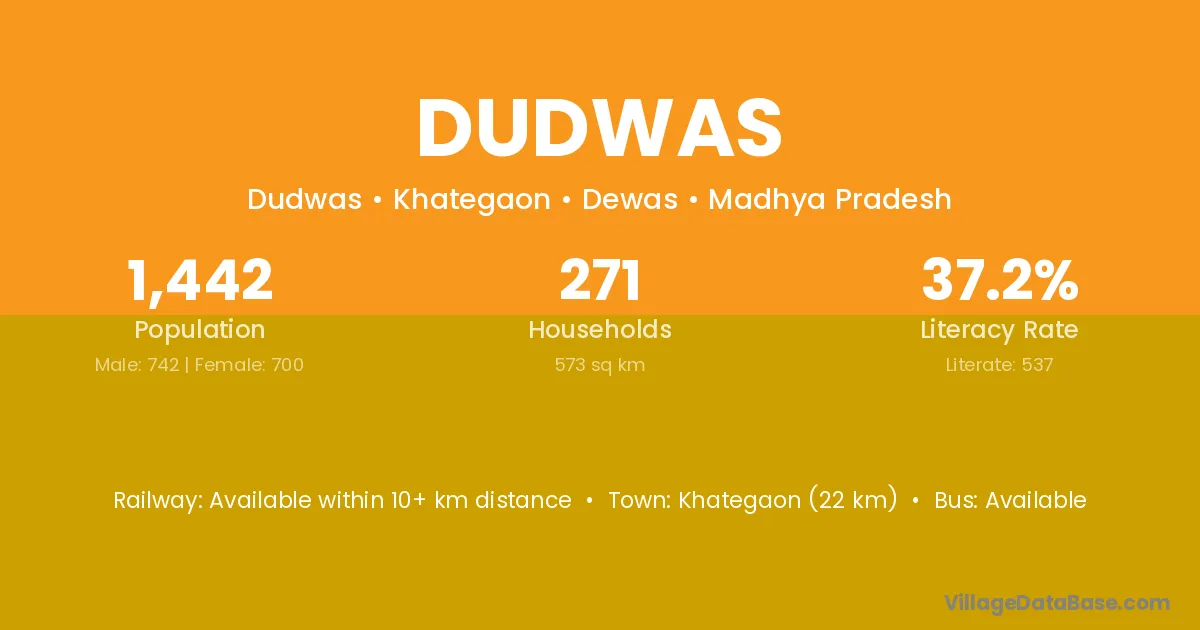 Khategaon (22 km) is the nearest town to Dudwas village for major economic activities and is located approximately 22 km away.