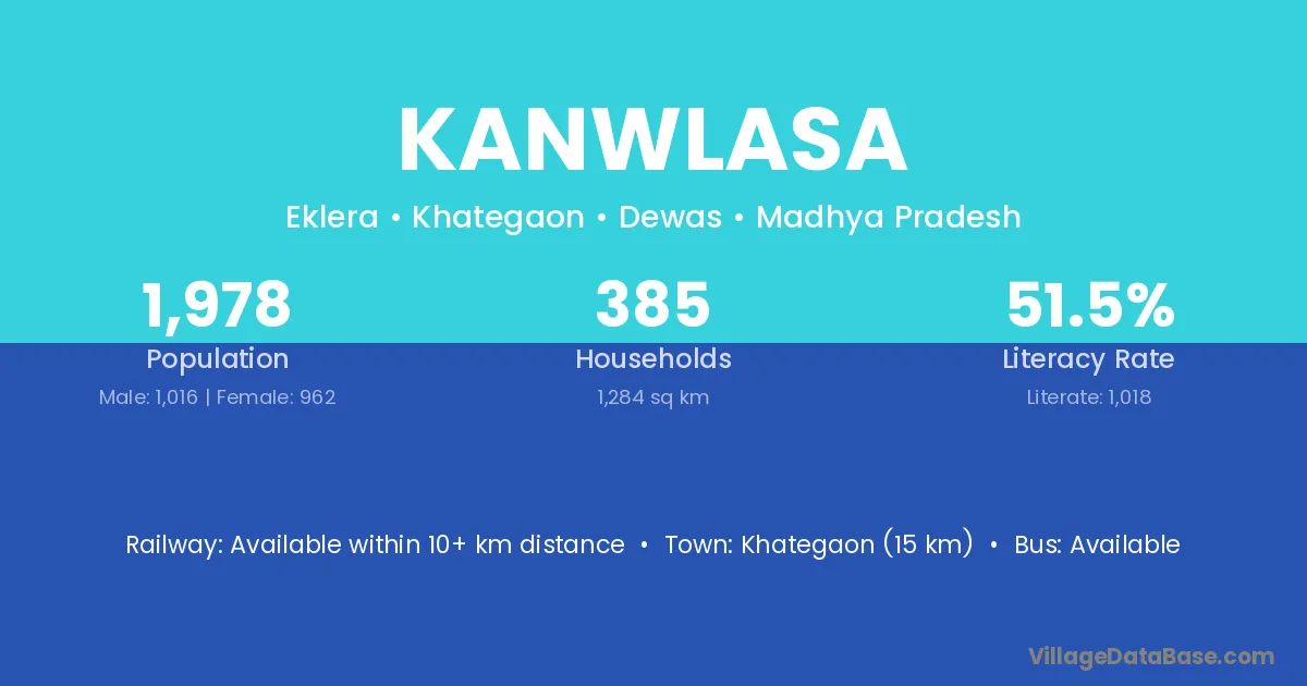 Khategaon (15 km) is the nearest town to Kanwlasa village for major economic activities and is located approximately 15 km away.