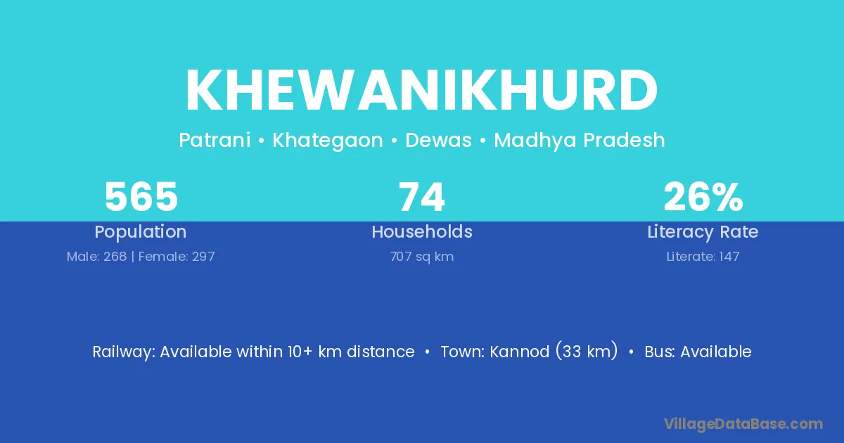 Kannod (33 km) is the nearest town to Khewanikhurd village for major economic activities and is located approximately 33 km away.