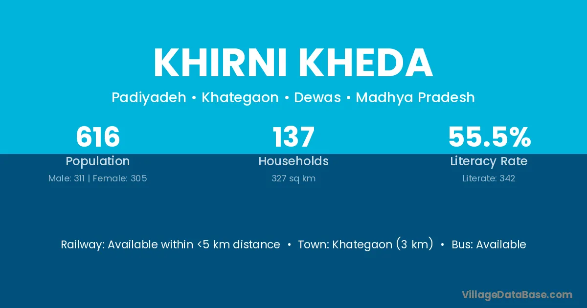 Khategaon (3 km) is the nearest town to Khirni Kheda village for major economic activities and is located approximately 3 km away.