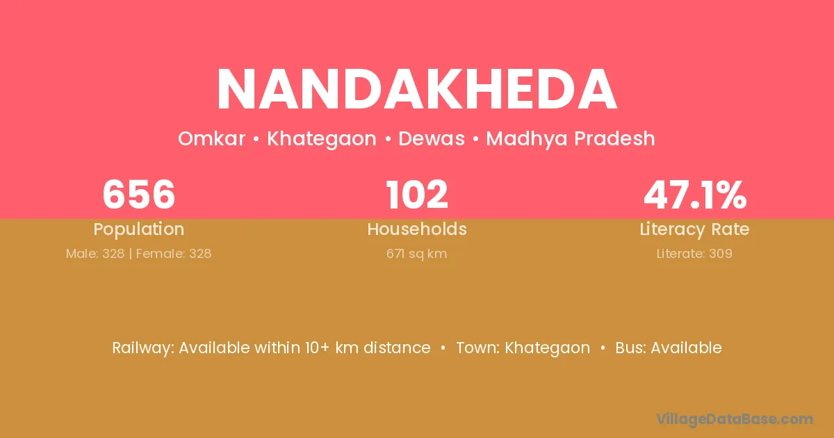 Nandakheda village has a total population of 656 people, of which 328 are males and 328 are females.