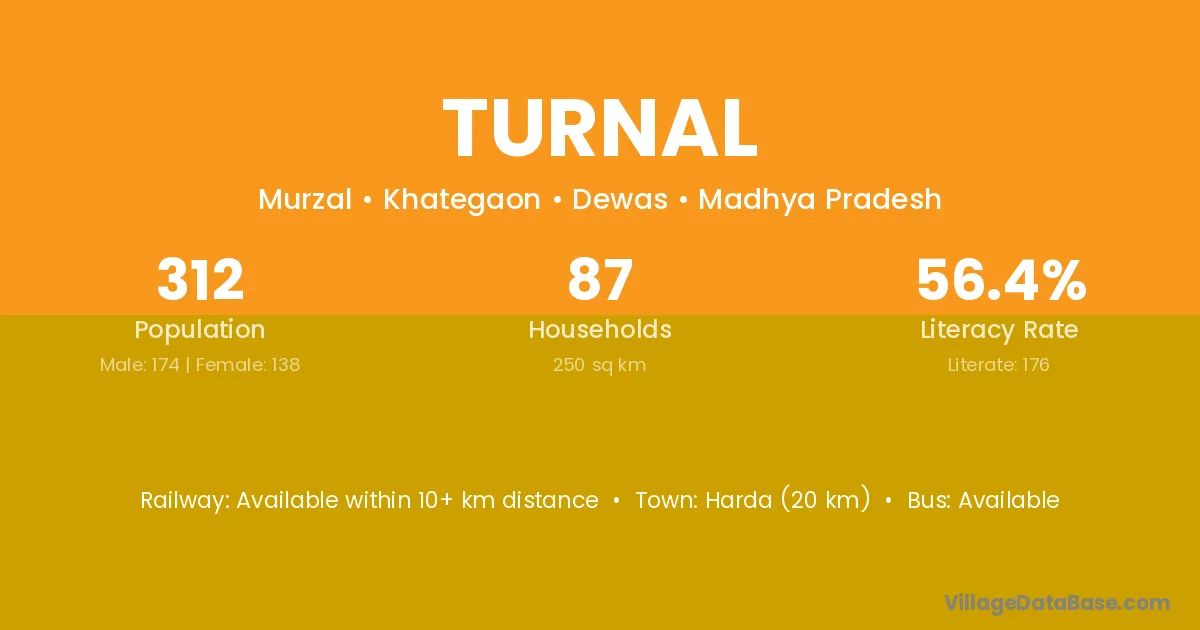 Harda (20 km) is the nearest town to Turnal village for major economic activities and is located approximately 20 km away.
