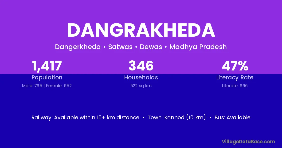 Dangrakheda village has a total population of 1,417 people, of which 765 are males and 652 are females.