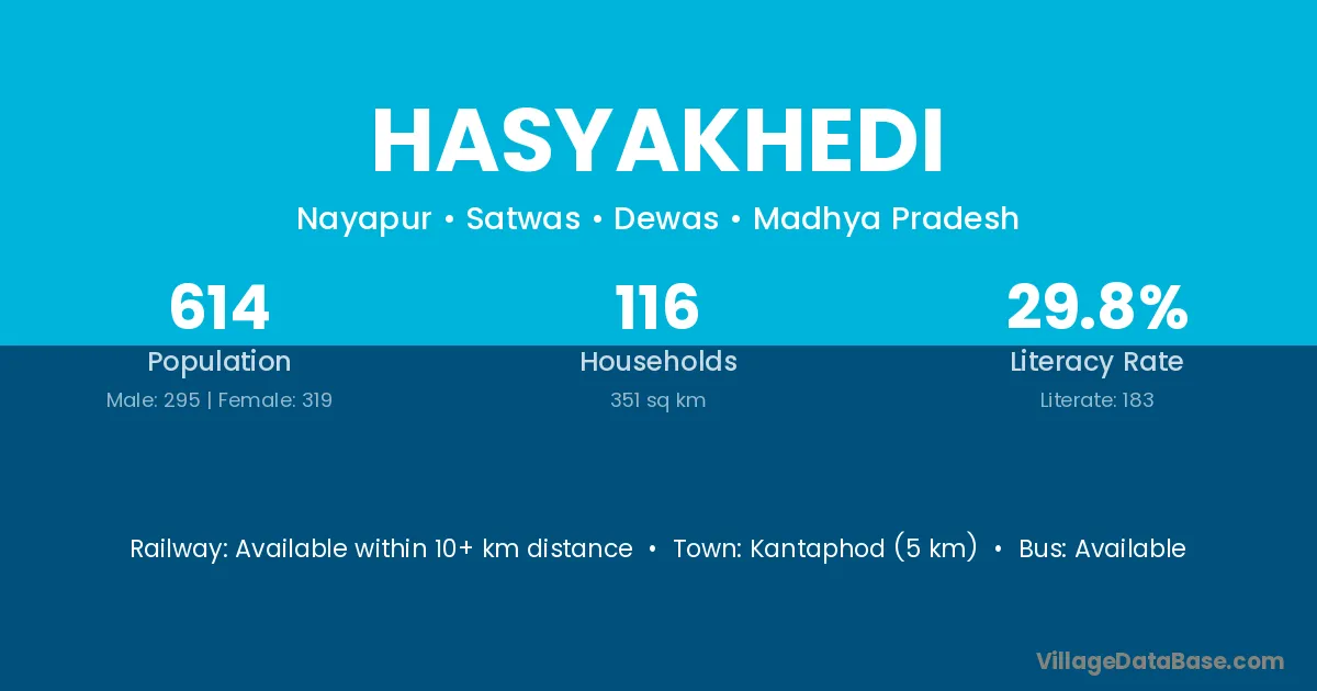 Hasyakhedi village has a total population of 614 people, of which 295 are males and 319 are females.