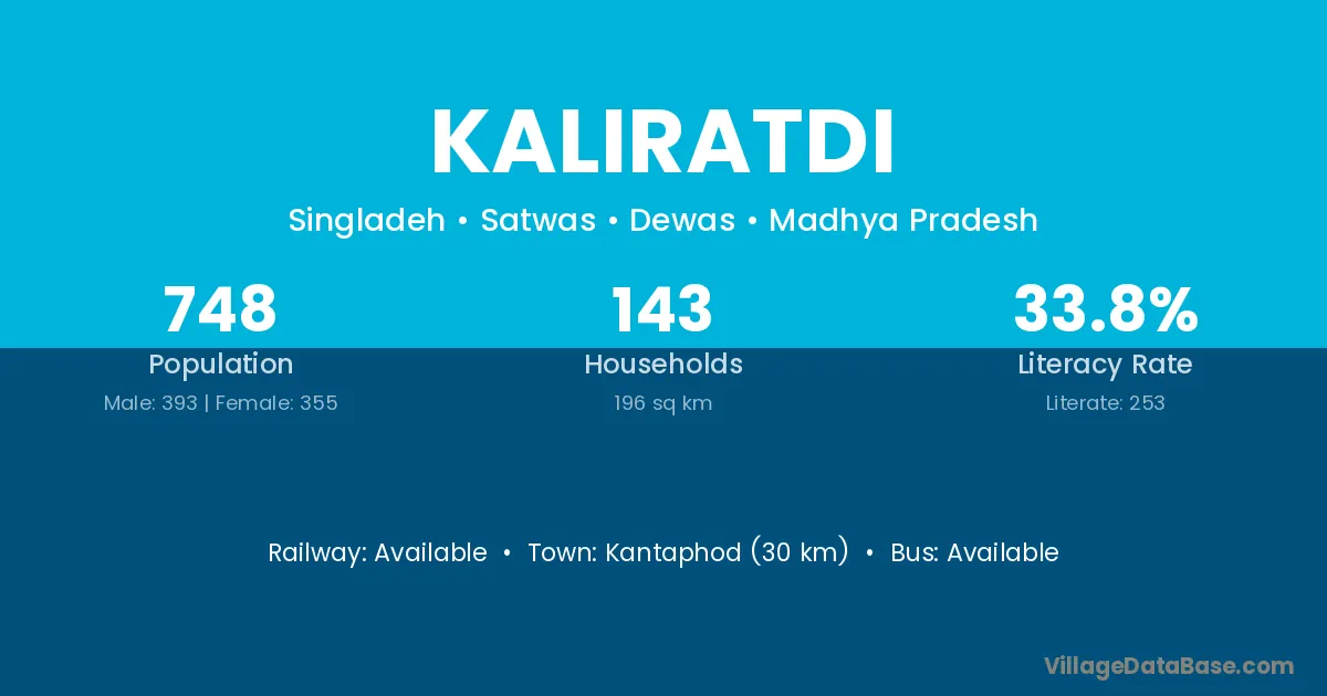 Kantaphod (30 km) is the nearest town to Kaliratdi village for major economic activities and is located approximately 30 km away.