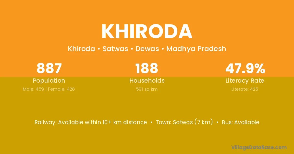 Satwas (7 km) is the nearest town to Khiroda village for major economic activities and is located approximately 7 km away.