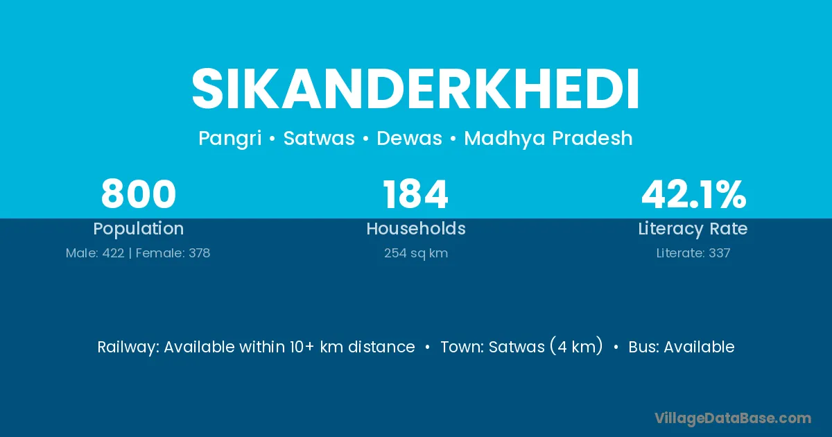 Sikanderkhedi village has a total population of 800 people, of which 422 are males and 378 are females.