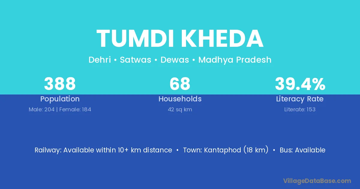 Kantaphod (18 km) is the nearest town to Tumdi Kheda village for major economic activities and is located approximately 18 km away.