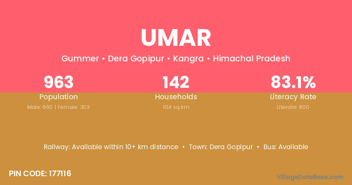 The literacy rate of Umar village is 43.59%. Male literacy stands at 52.74% and female literacy at 33.94%.