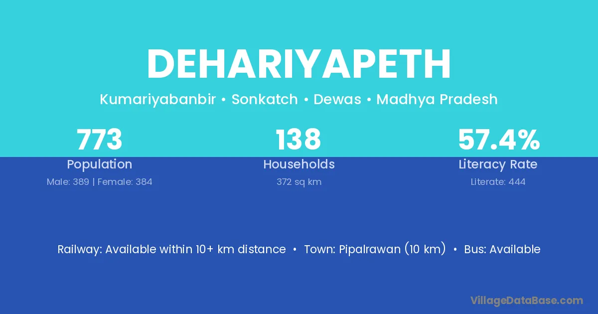 Dehariyapeth village has a total population of 773 people, of which 389 are males and 384 are females.