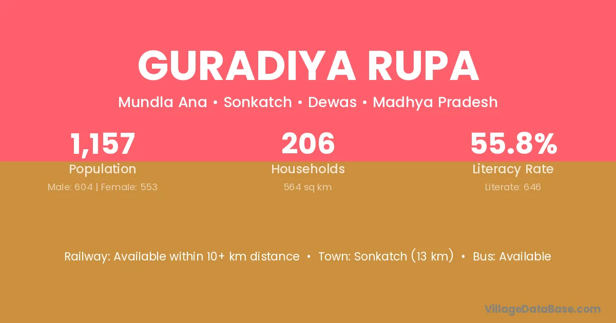Guradiya Rupa village has a total population of 1,157 people, of which 604 are males and 553 are females.