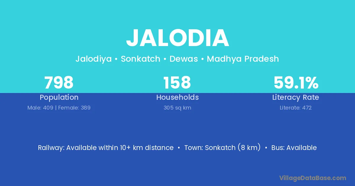 Sonkatch (8 km) is the nearest town to Jalodia village for major economic activities and is located approximately 8 km away.