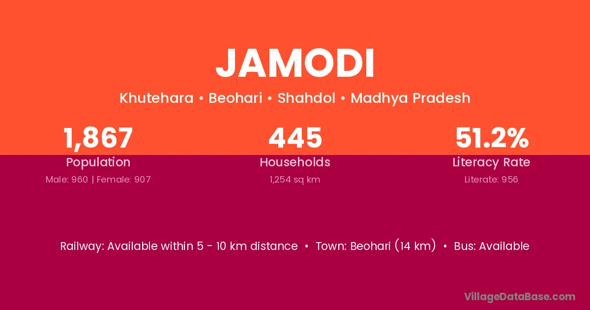 The literacy rate of Jamodi village is 48.83%. Male literacy stands at 58.46% and female literacy at 37.86%.