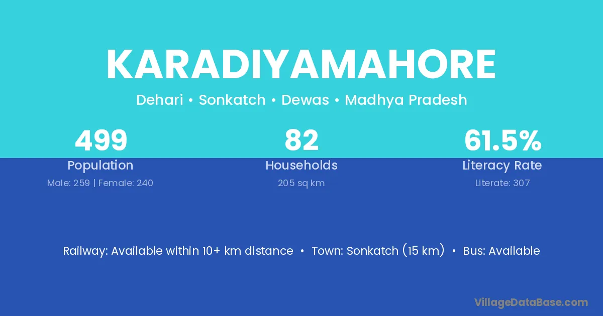 Sonkatch (15 km) is the nearest town to Karadiyamahore village for major economic activities and is located approximately 15 km away.