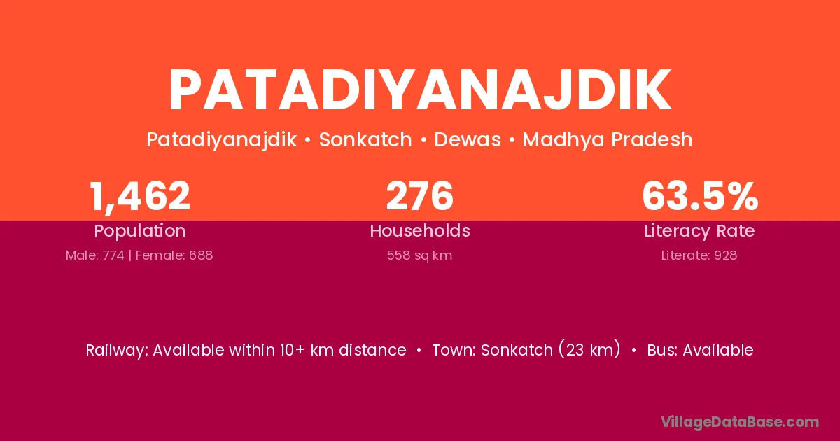 Sonkatch (23 km) is the nearest town to Patadiyanajdik village for major economic activities and is located approximately 23 km away.