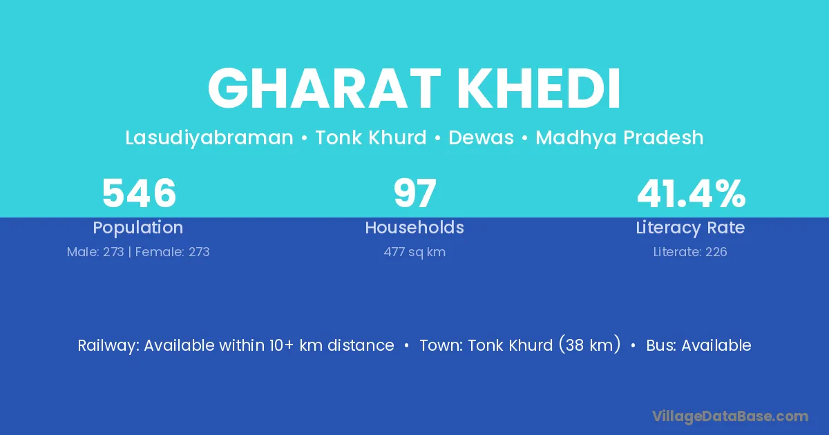 Gharat Khedi village has a total population of 546 people, of which 273 are males and 273 are females.