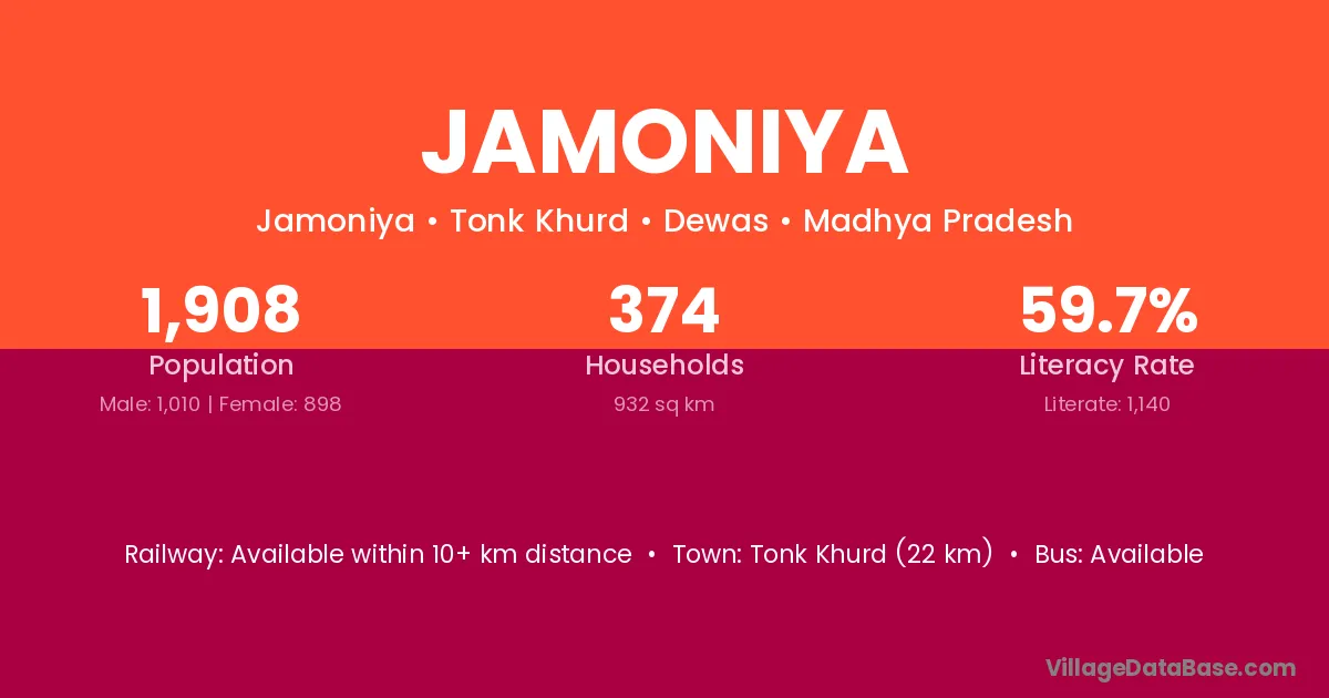 Tonk Khurd (22 km) is the nearest town to Jamoniya village for major economic activities and is located approximately 22 km away.