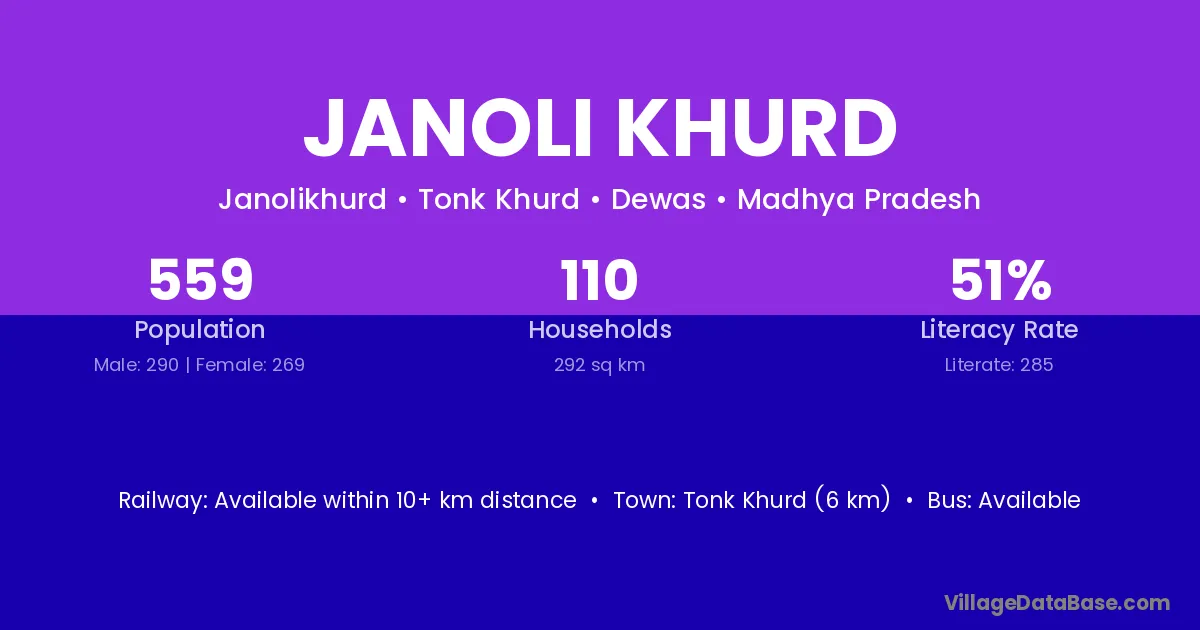 Tonk Khurd (6 km) is the nearest town to Janoli Khurd village for major economic activities and is located approximately 6 km away.
