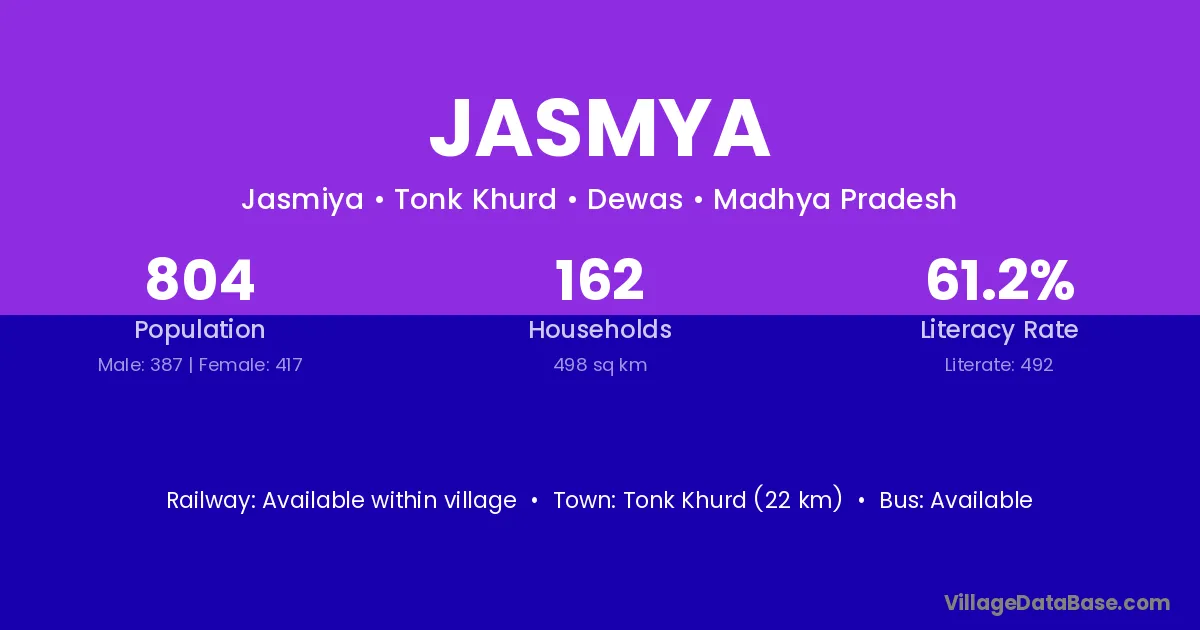 Tonk Khurd (22 km) is the nearest town to Jasmya village for major economic activities and is located approximately 22 km away.